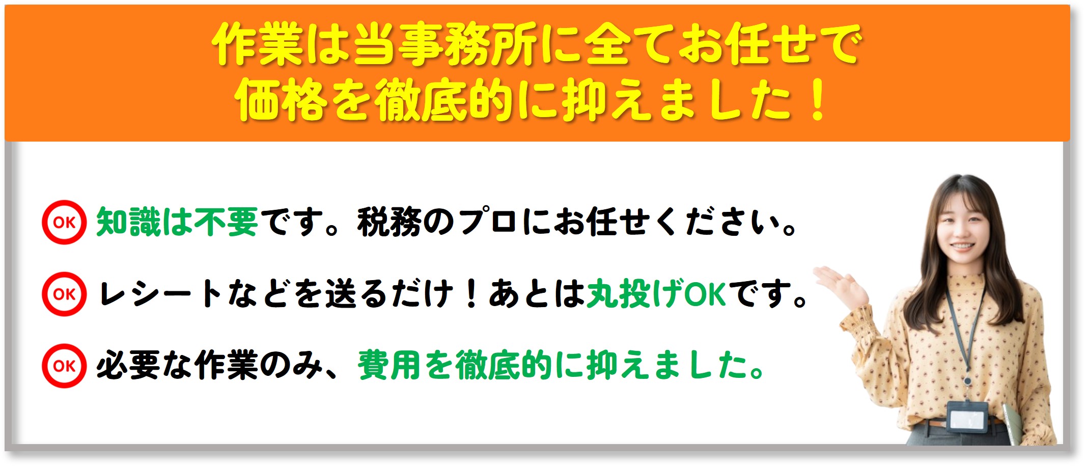 ※資料提出期限を過ぎた場合の緊急対応、期限後申告、修正申告など追加作業が生じる場合は別途お見積りとなります。